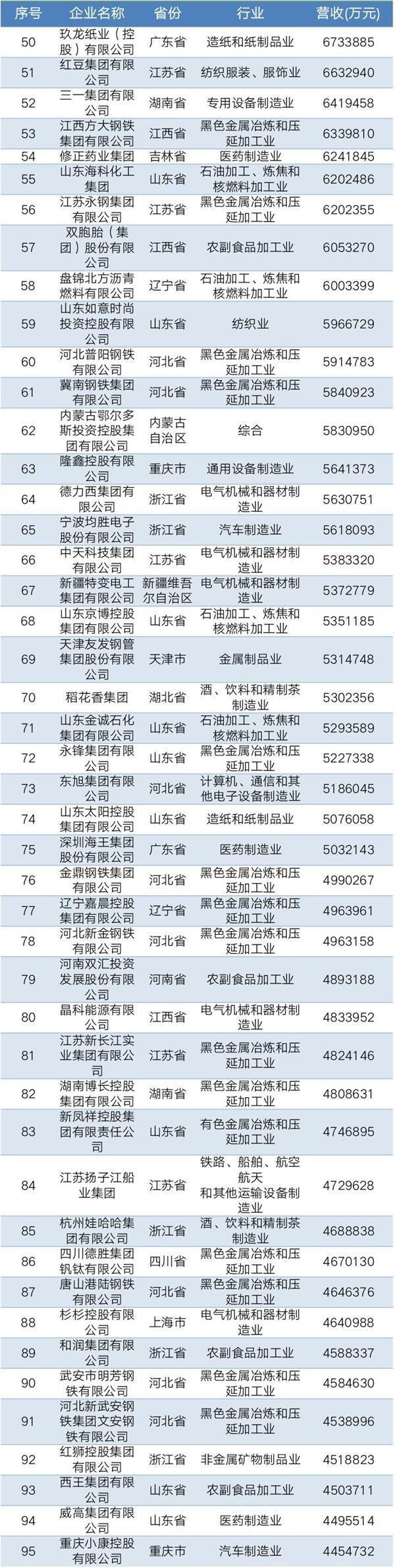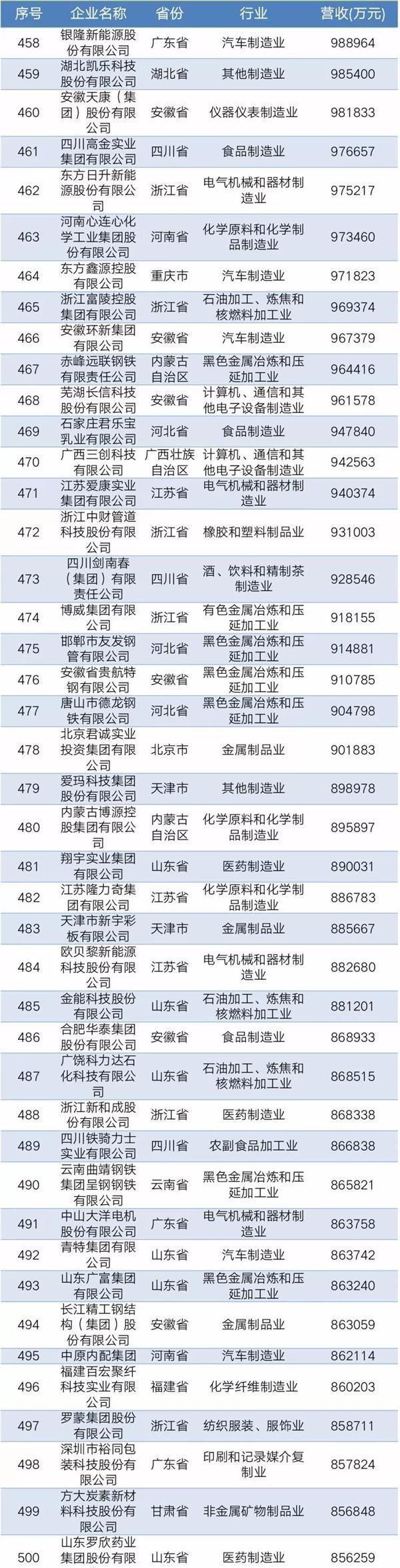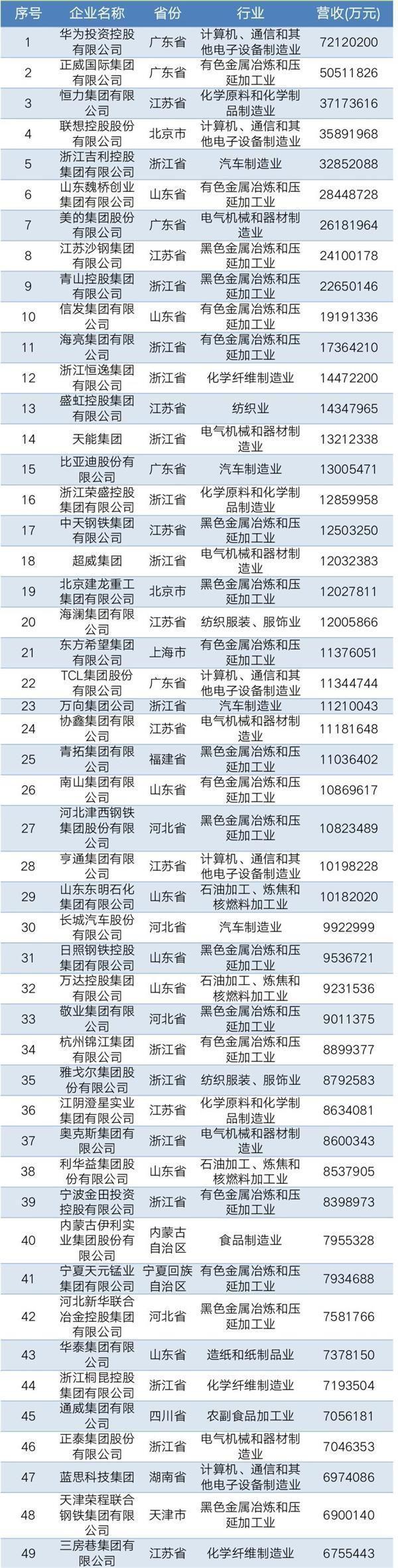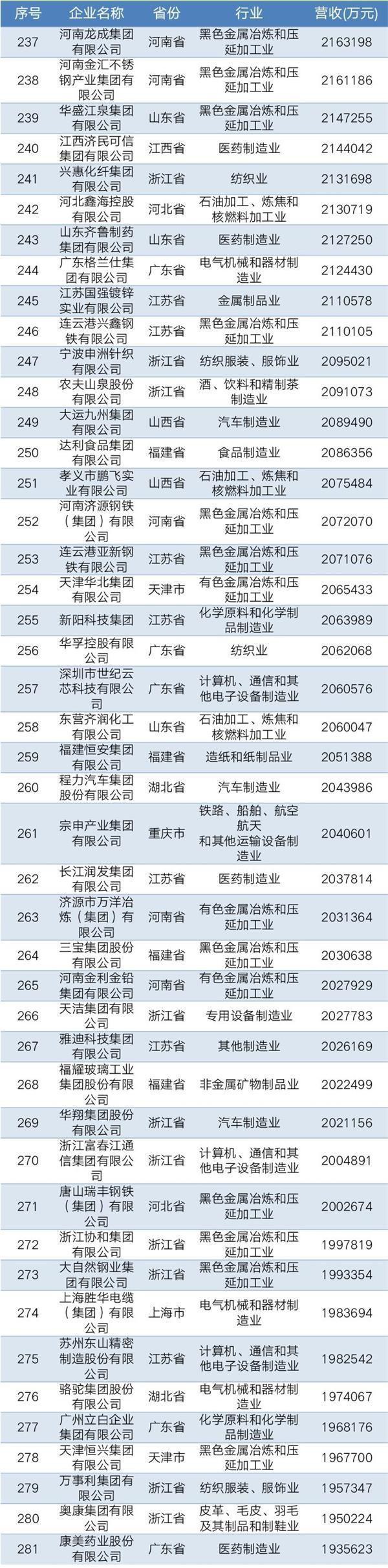 2019年中國民營企業(yè)制造業(yè)500強名單