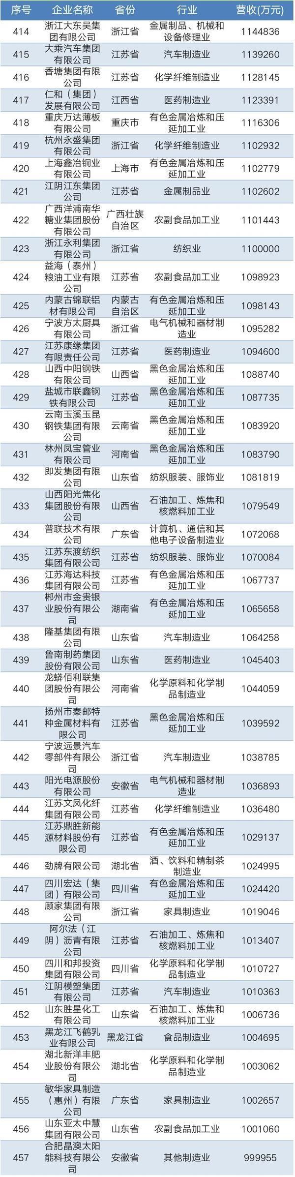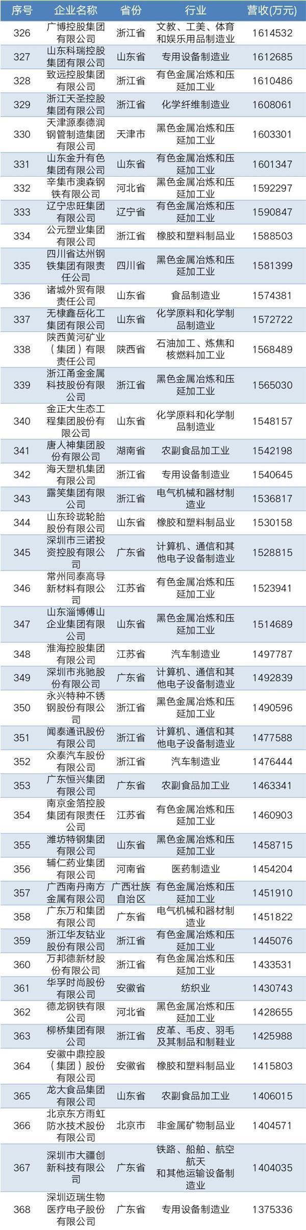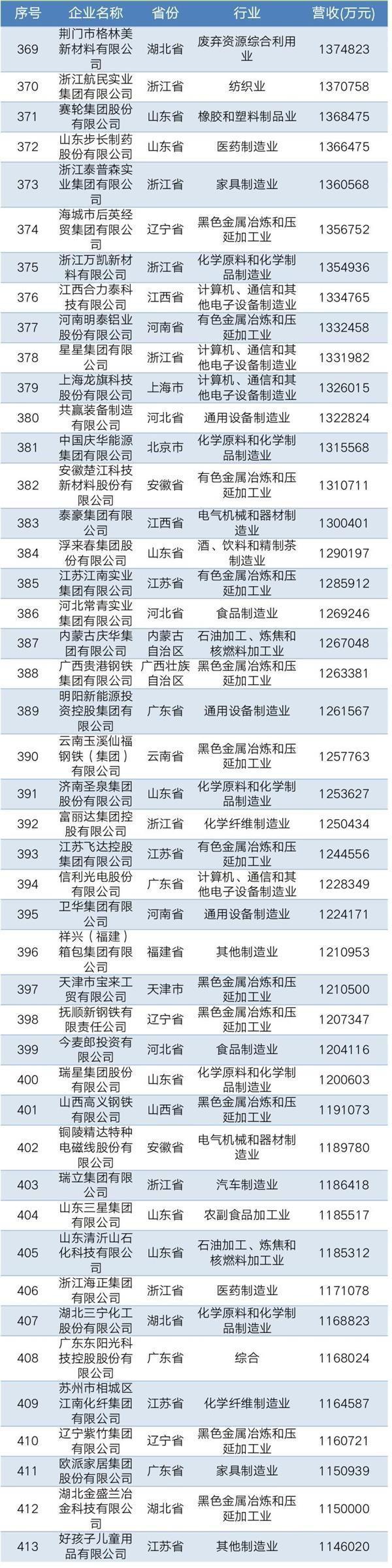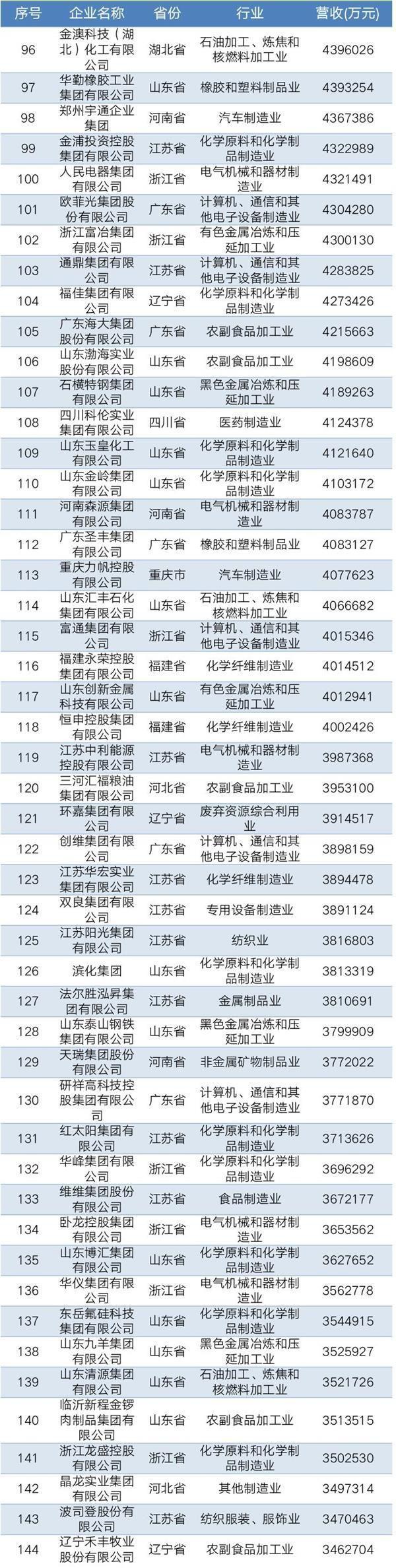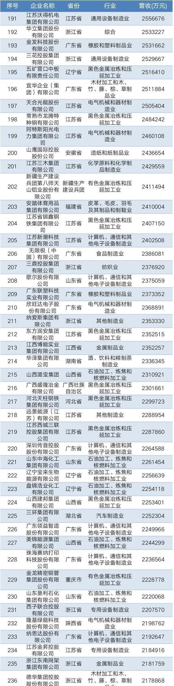 2019年中國民營企業(yè)制造業(yè)500強名單