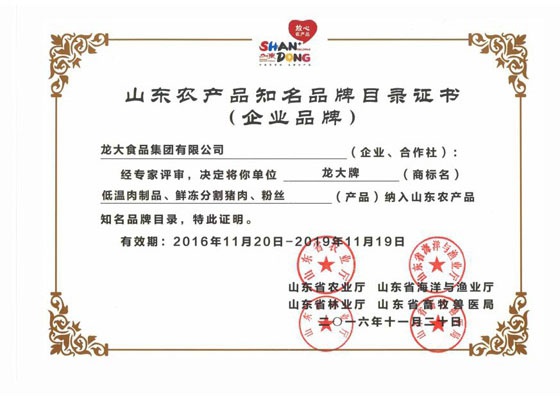 11月20日,山東省農業廳、海洋與漁業廳、林業廳、畜牧獸醫局聯合公布了《山東省首批知名農產品區域公用品牌和企業產品品牌名單》,龍大食品集團有限公司生產的龍大牌低溫肉制品、龍大牌鮮凍分割豬肉和龍大牌粉絲三個產品入選《山東省首批知名農產品企業品牌目錄》。