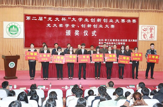 12月11日,山東農業大學食品科學與工程專業學生董銘、李秀清等35名學子,在“龍大獎學金、創新創業大賽”頒獎儀式上領到了龍大食品集團有限公司頒發的獎學金,獲得龍大集團獎勵的還有10個大學生創新創業團隊。